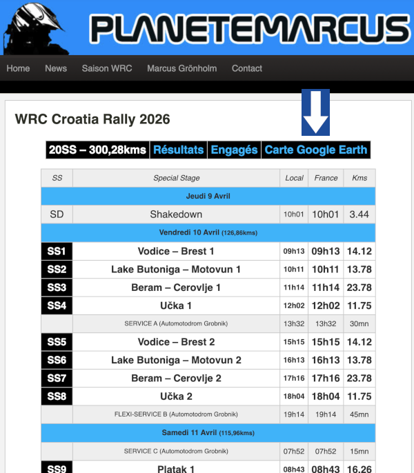 D’après une idée originale de Dimitri Dusart depuis plusieurs saisons maintenant, la carte Google Earth de chaque épreuve du championnat du monde des rallyes est disponible gratuitement sur PLANETEMARCUS. Elle vous permet de vous organiser au mieux avant de vous rendre sur place (préparer le timing, choisir les bons endroits…).