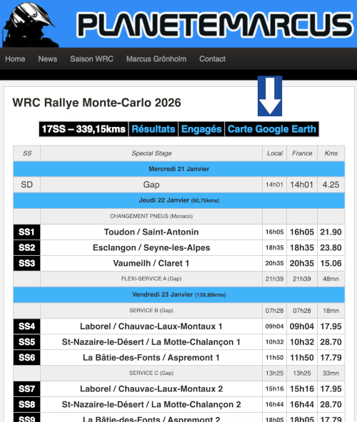 D’après une idée originale de Dimitri Dusart depuis plusieurs saisons maintenant, la carte Google Earth de chaque épreuve du championnat du monde des rallyes est disponible gratuitement sur PLANETEMARCUS. Elle vous permet de vous organiser au mieux avant de vous rendre sur place (préparer le timing, choisir les bons endroits…).
