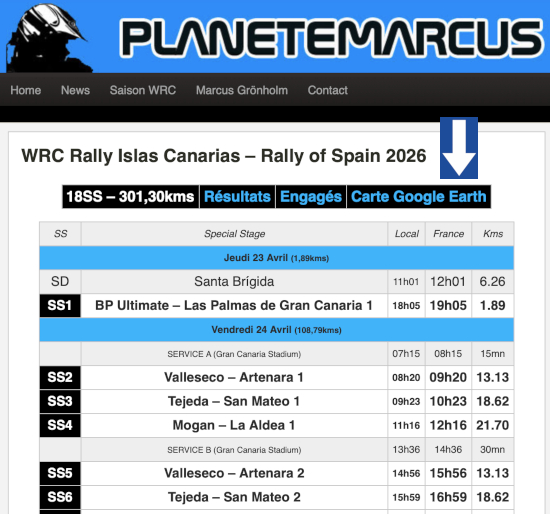 D’après une idée originale de Dimitri Dusart depuis plusieurs saisons maintenant, la carte Google Earth de chaque épreuve du championnat du monde des rallyes est disponible gratuitement sur PLANETEMARCUS. Elle vous permet de vous organiser au mieux avant de vous rendre sur place (préparer le timing, choisir les bons endroits…).